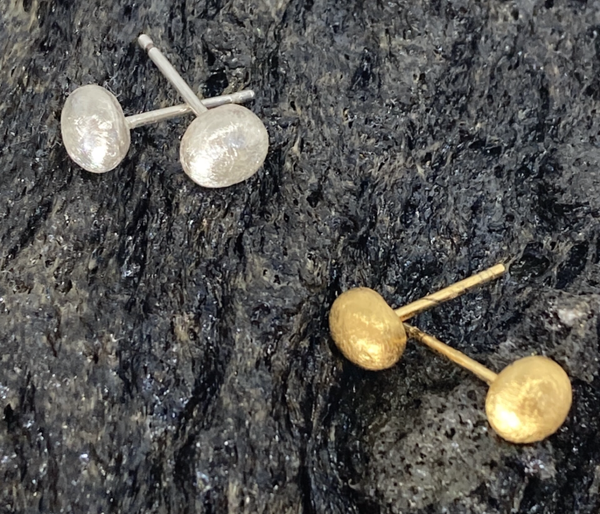 Suze, mat geborstelde oorstekertjes. Ik smelt het zilver tot een grillig balletje en werk af met een geschuurd oppervlak. Daardoor hebben ze een unieke, matte uitstraling. Elk paartje is uniek.